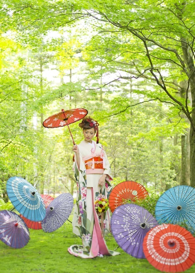 最先端トレンドのカラードレスは、色・柄ともに豊富に取り扱っています。和装も、白無垢も色打掛など、シーンやシチュエーションに合わせてお選びいただけます